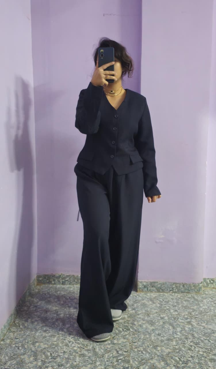 A sleek black blazer and trouser co-ord set designed for modern working women. Perfect for office meetings, formal days, and power dressing with comfort and elegance.