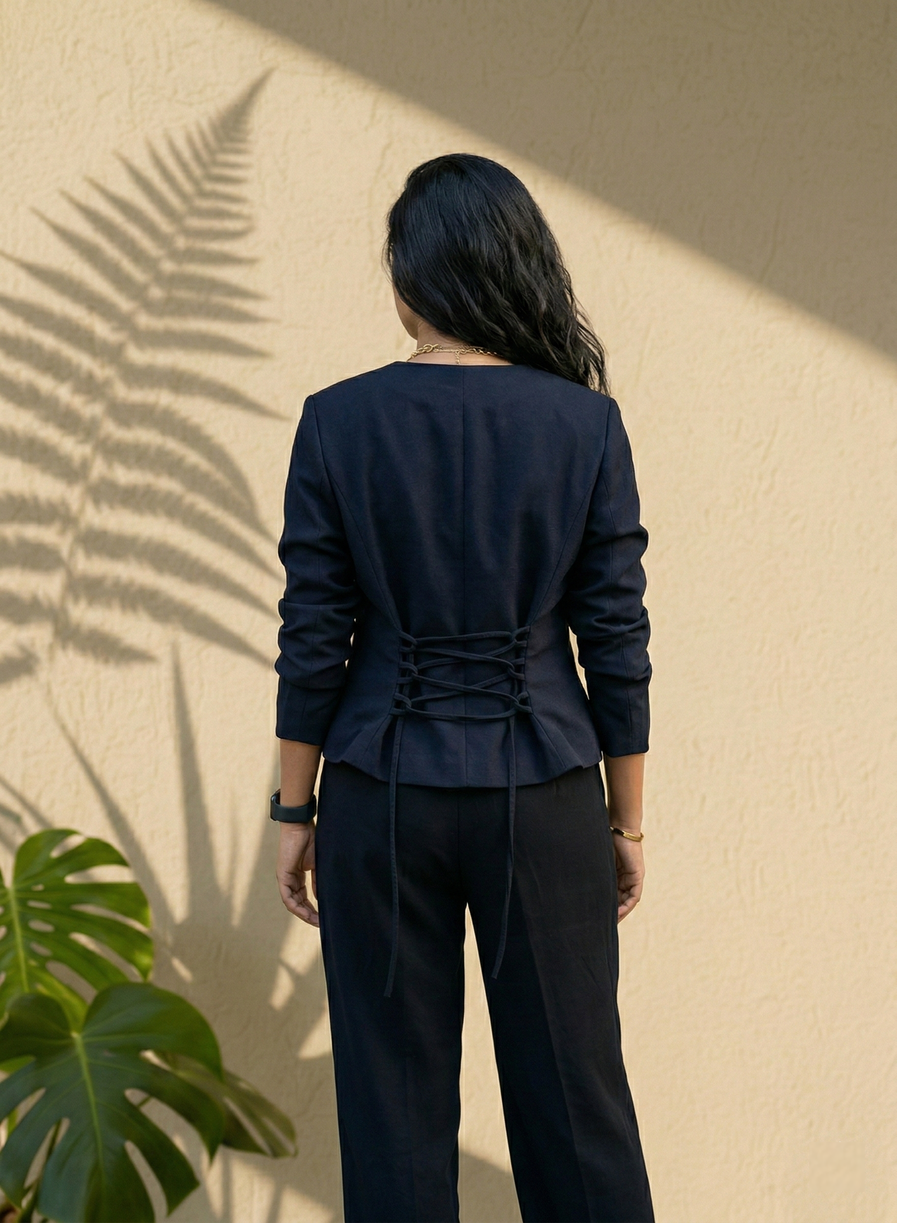 A sleek black blazer and trouser co-ord set designed for modern working women. Perfect for office meetings, formal days, and power dressing with comfort and elegance.