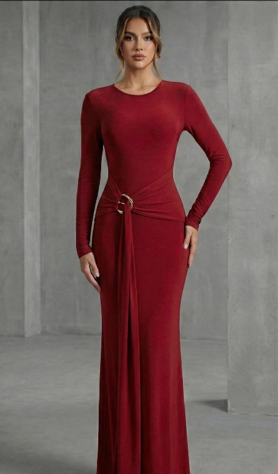 A sculpted cherry-red bodycon dress featuring a sleek waist buckle that defines and flatters the silhouette. Minimal, powerful, and effortlessly elegant, made for statement evenings and refined occasions.