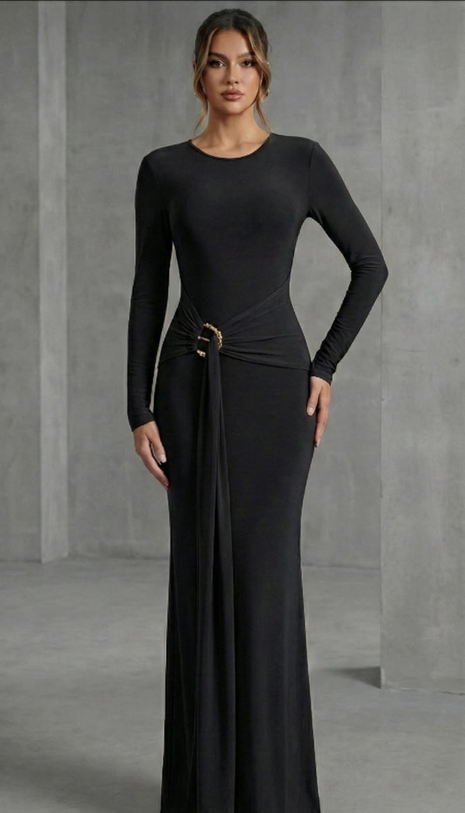 A sculpted black bodycon dress featuring a sleek waist buckle that defines and flatters the silhouette. Minimal, powerful, and effortlessly elegant—made for statement evenings and refined occasions.