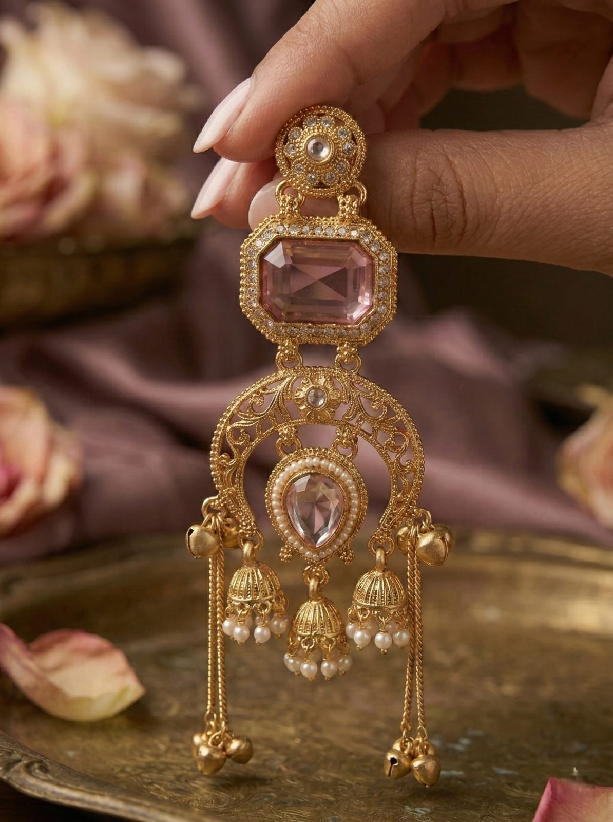 A celebration of intricate design and soft glamour, Mehr Gul Kashmiri Jhumkas feature a structured geometric rose centerpiece balanced by traditional crescent detailing. Finished with pearl drops and delicate ghungroos, this pair embodies heritage luxury with contemporary charm.