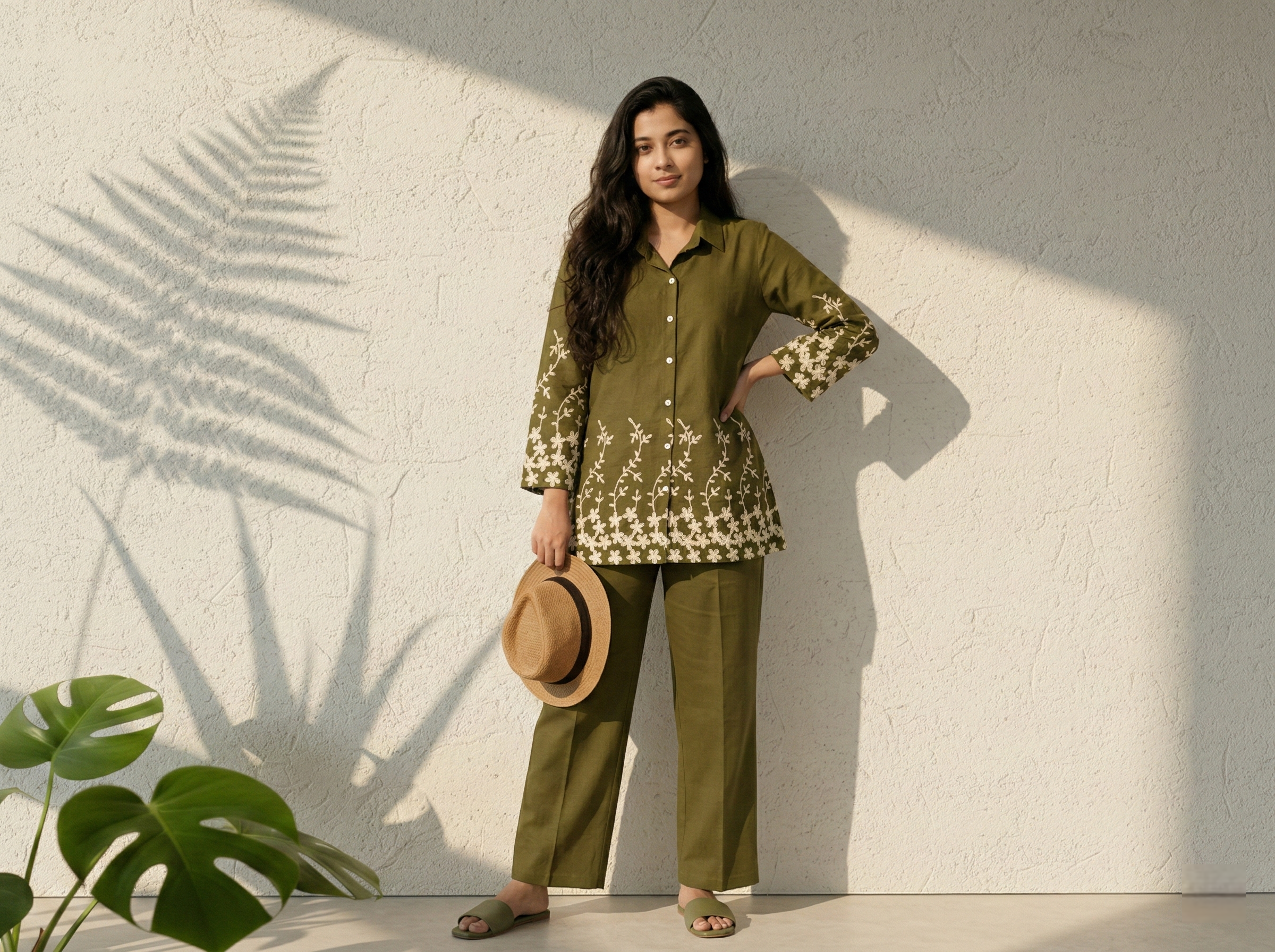 An olive green embroidered co-ord inspired by nature’s calm elegance. Soft, breathable, and beautifully detailed—perfect for serene daytime outings and effortless chic looks.