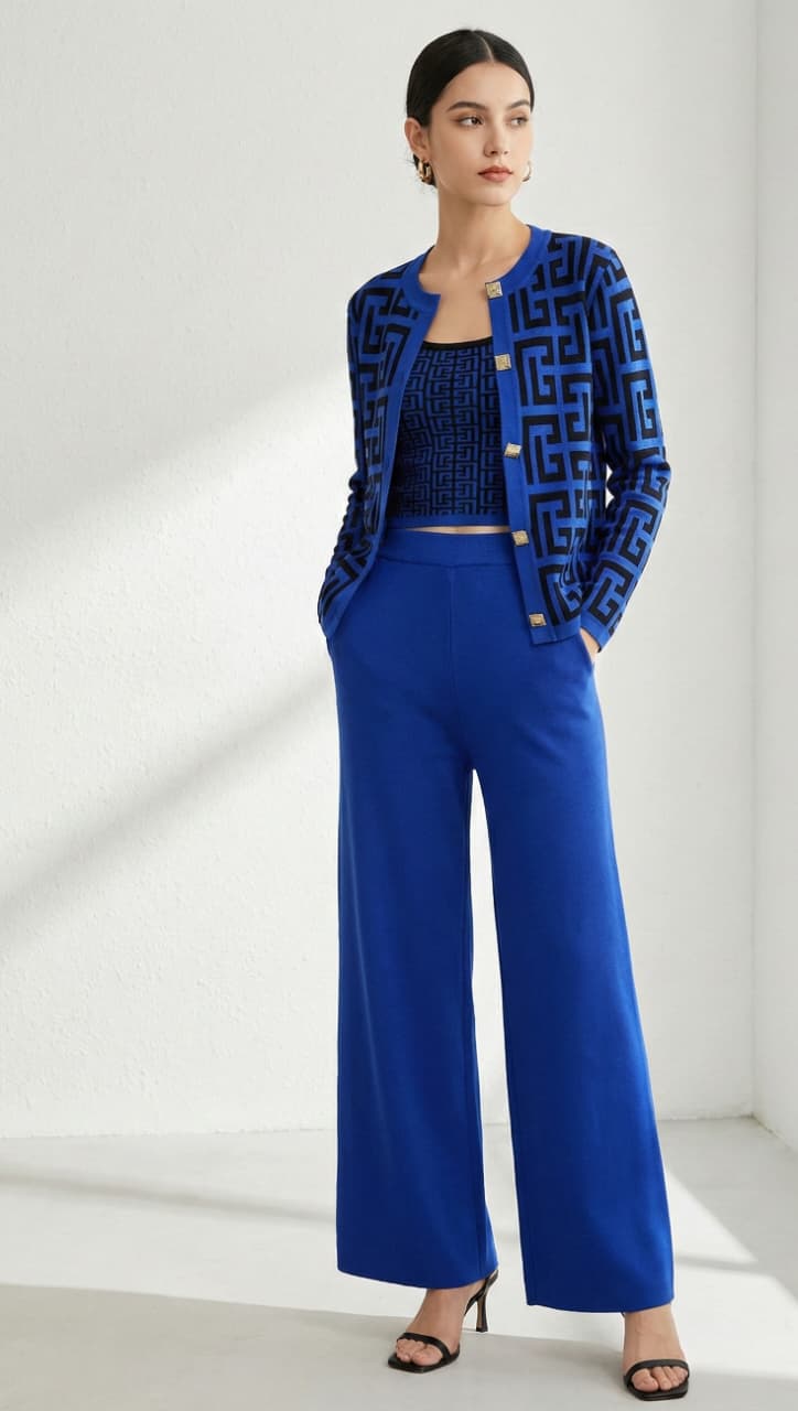 A stylish knitted western co-ord set featuring a cropped top, buttoned cardigan, and high-waist wide-leg pants. Designed for comfort with a luxe feel, perfect for casual outings or chic evenings.