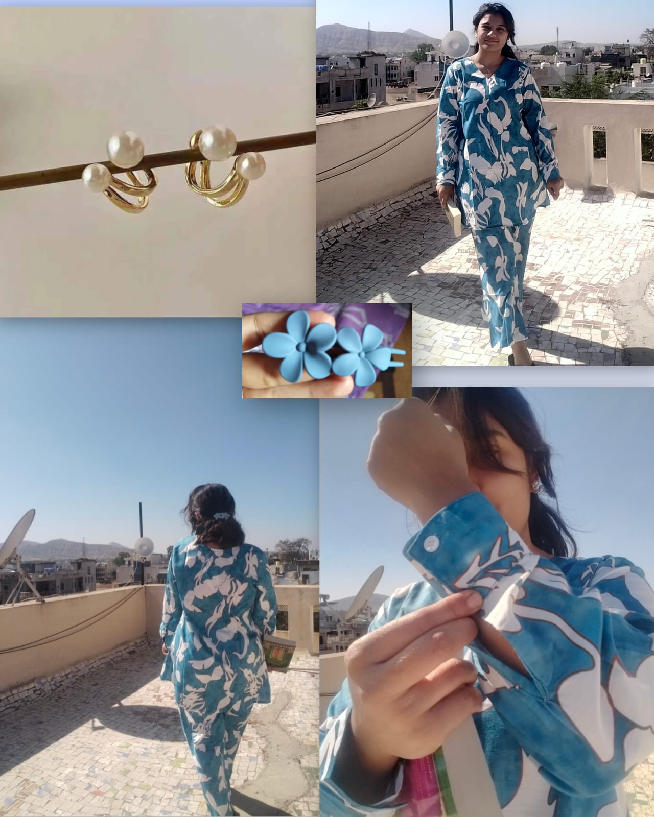 Professional blue cordset with subtle prints. Elegant office wear that transitions perfectly to evening events.
