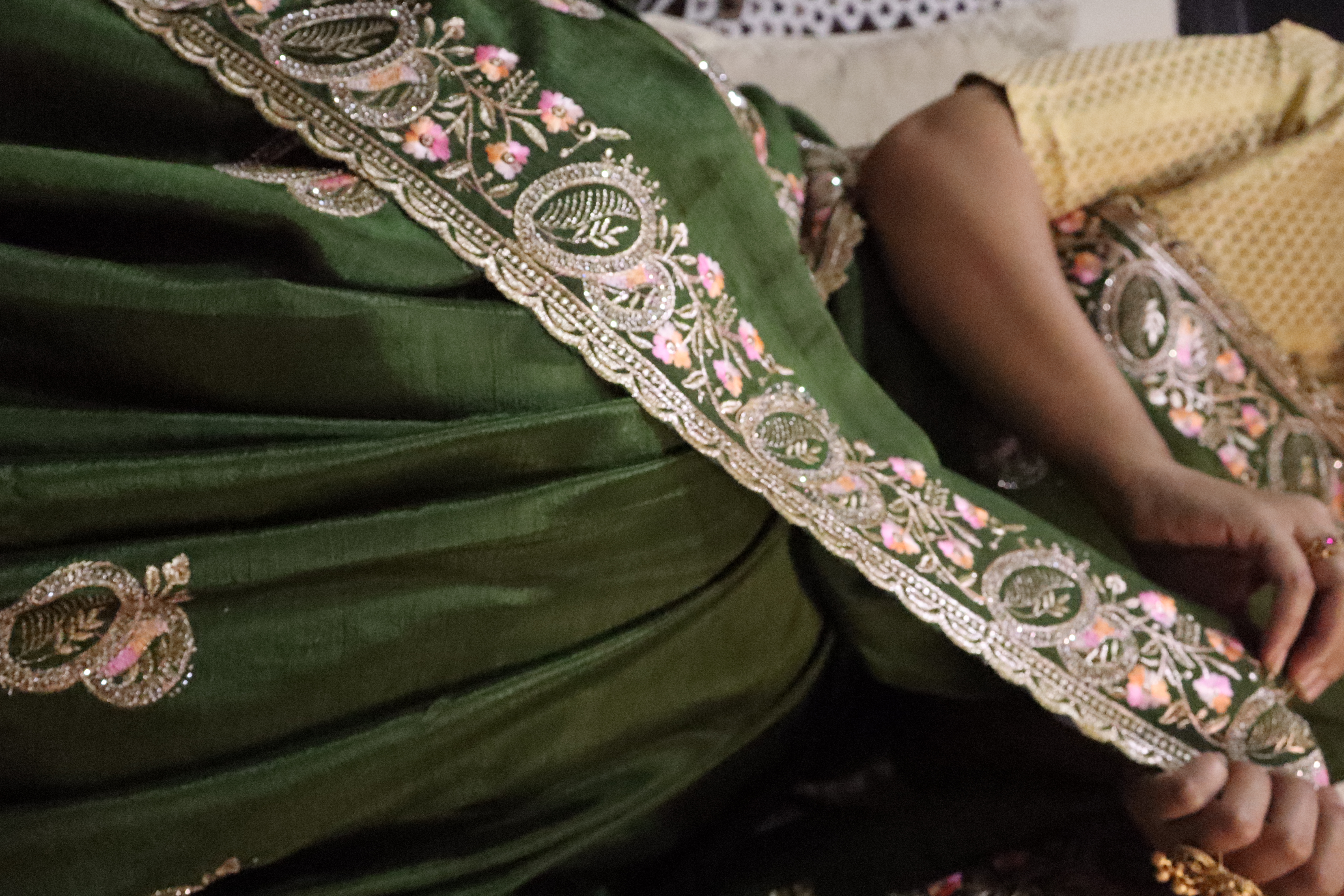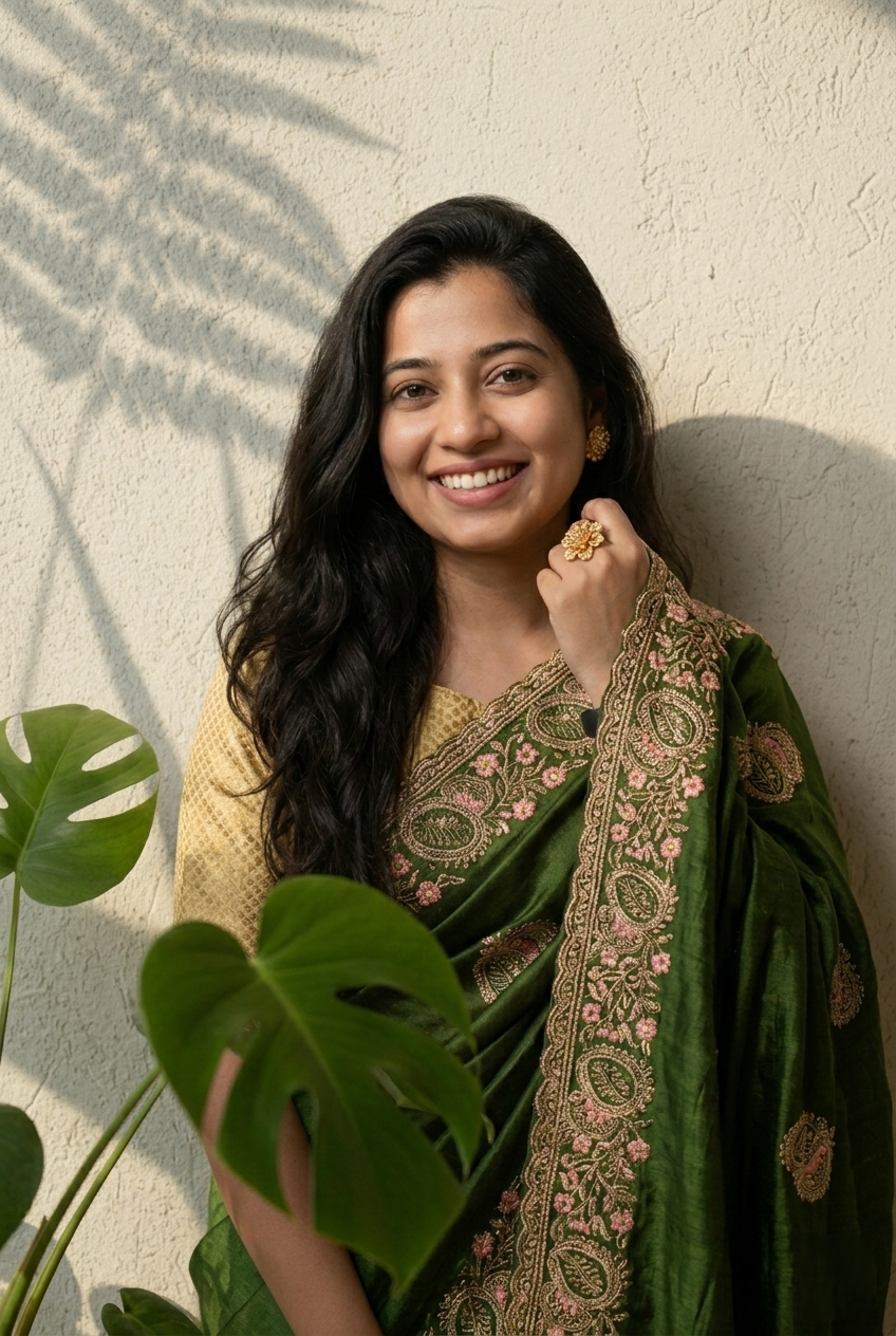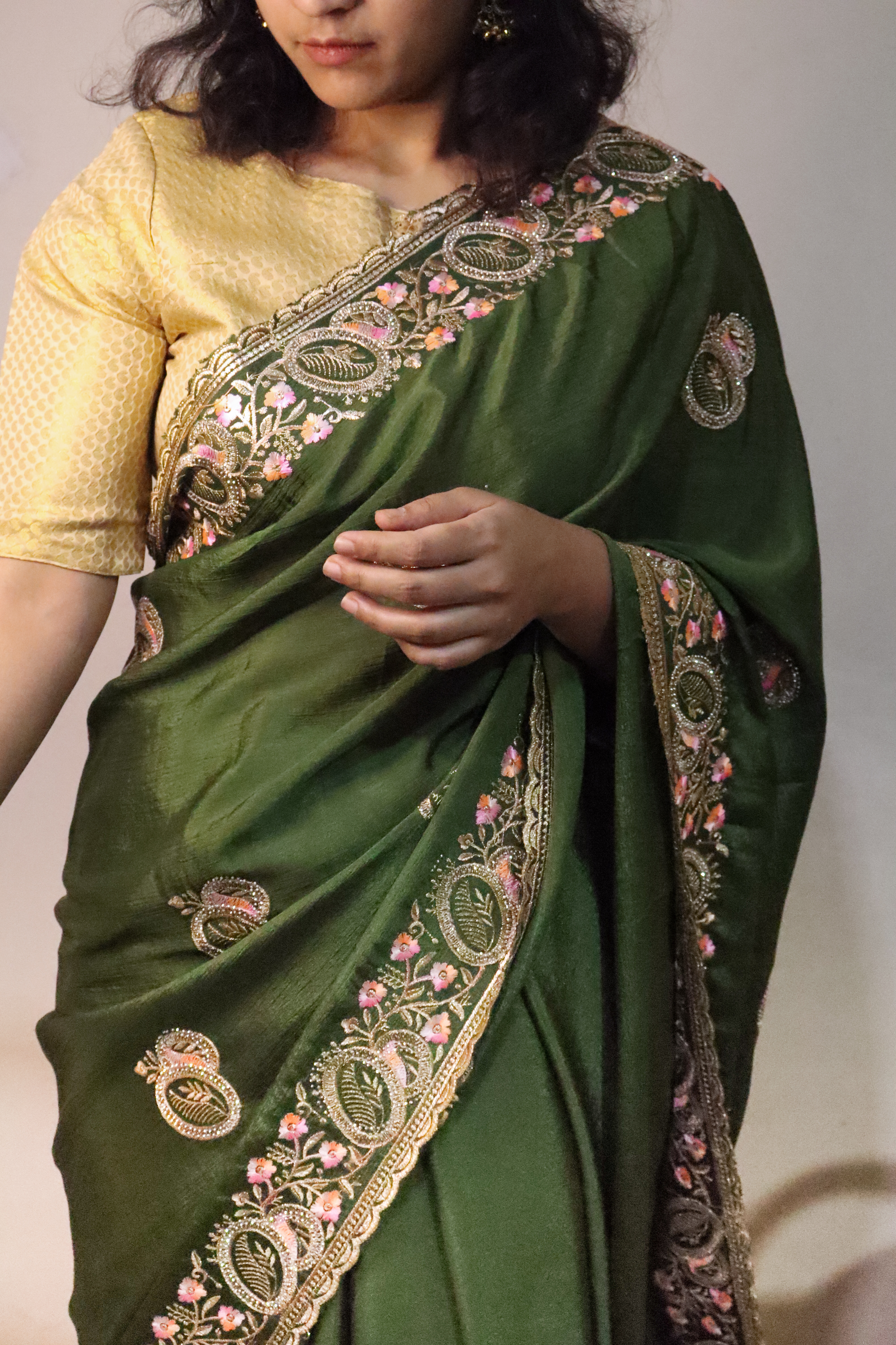 A graceful chiffon saree adorned with intricate floral embroidery along the borders and pallu. Delicate gold threadwork paired with soft pink and aqua motifs adds a refined festive charm, while subtle butti embroidery scattered across the body enhances its elegance. Lightweight and flowy, this saree drapes beautifully, making it perfect for festive occasions, family gatherings, and evening celebrations.Style it with antique gold jewellery featuring aqua stone detailing to complete a timeless ethnic look that effortlessly blends tradition with sophistication.